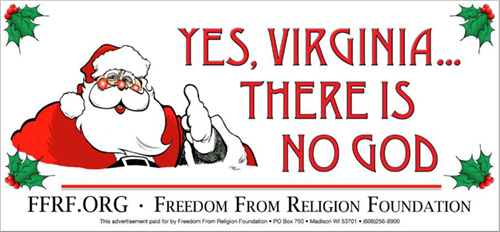 Here’s my question–how can you on the one hand honestly believe and argue that there is no such thing as a war on Christmas and then simultaneously post an advertisement from Freedom from Religion Foundation stating that there is no God, and not only that, but next to an iconic Christmas image like Santa?