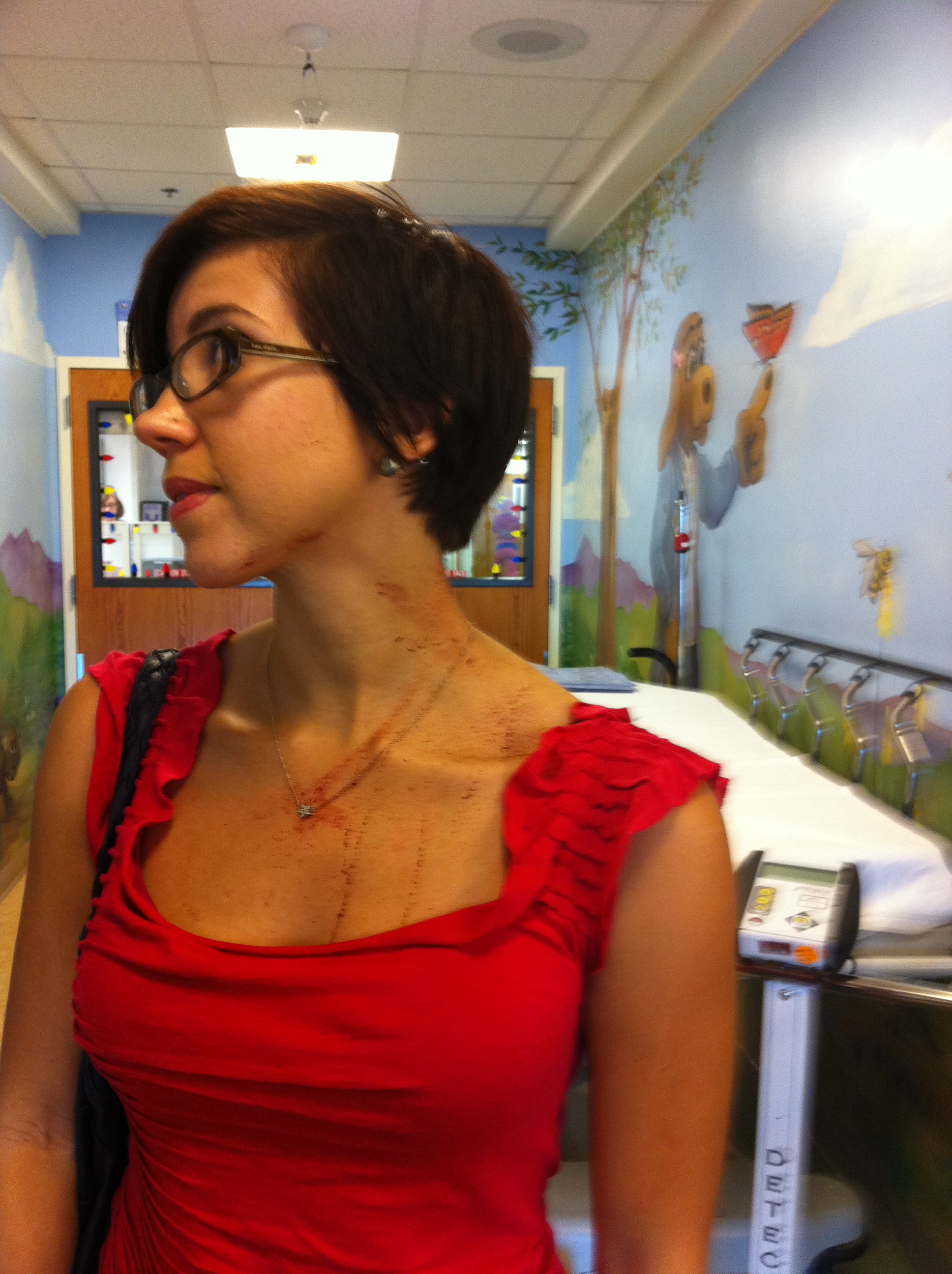 Then, when she was 6, we were in upstate NY and it was icy. She fell and hit her forehead on a rock. We found the nearest doc-in-the-box and she got her head stitched up. When Lance was carrying her to the car after falling, she was more concerned about bleeding on Lance’s jacket than the cut on her head.