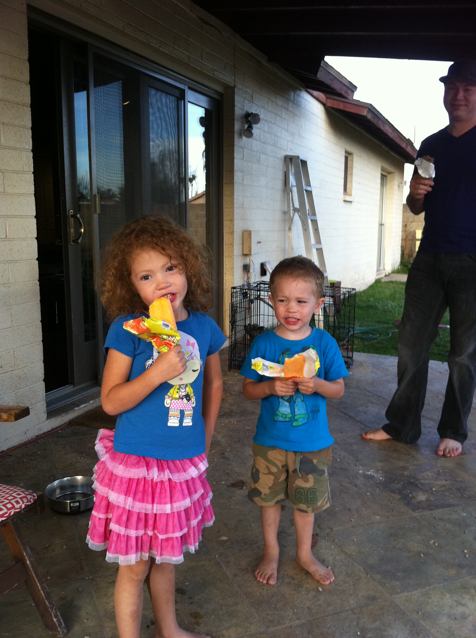 My Kids had their first run-in with the ice cream truck. The music slowly started drifting down the steert, my husband bolted for the door, ran outside and flagged the truck down just in time to buy them $4 worth of frozen confections. They were delighted and asked for the next 3 days when exactly this magical, musical truck toting ice cream would be making another appearance. I have a feeling it’s going to be a long, hot, expensive, sticky summer.