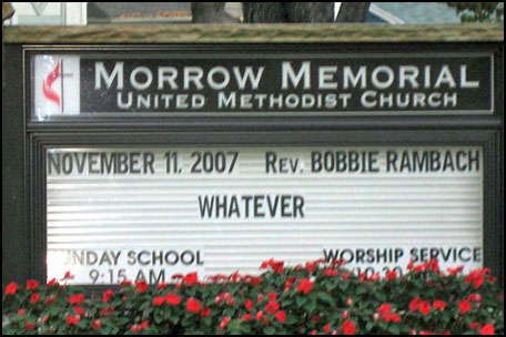 Oh, the editor in me cringes at the apostrope in the church sign where there shouldn’t be one…and that one about coming to hear our preacher if you want to know about hell was priceless…right up there with “whatever.”